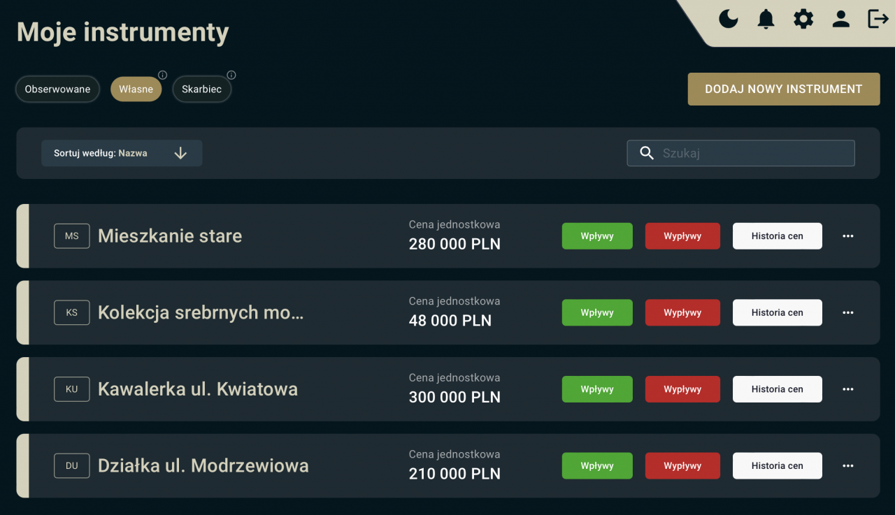 Aby skorzystać z Cashflow, wystarczy wejść w dział „Moje instrumenty”, a następnie wybrać zakładkę „Własne”. Tam można dodać dowolny składnik naszego majątku.