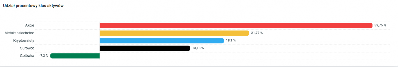 Dodaliśmy również wykres przedstawiający udział klas aktywów w wersji słupkowej. Dzięki temu zyskujemy nowy sposób spojrzenia na posiadane przez nas aktywa. Taka prezentacja pozwala też pokazać ujemną gotówkę, jeśli takowa sytuacja ma miejsce, na przykład, gdy kupujemy aktywa za środki pożyczone od brokera.
