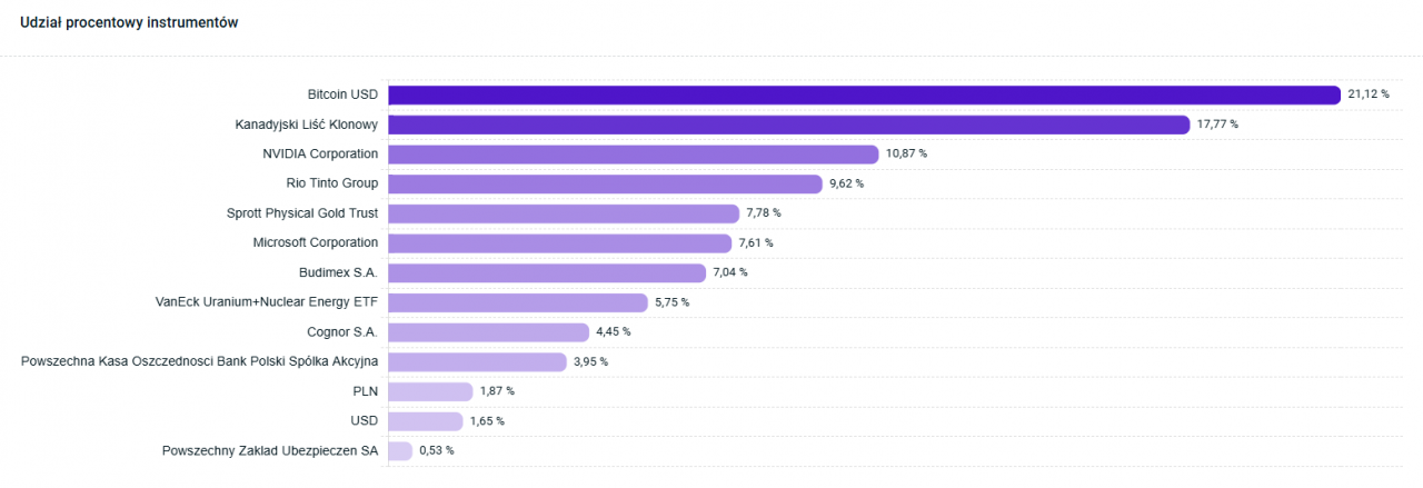 W miarę rozwoju Portfeo rozrasta się o kolejne przydatne funkcje. Jedną z nich jest poziomy wykres słupkowy, na którym możemy zobaczyć, jaki udział w portfelu stanowią konkretne instrumenty. Możemy go zobaczyć w podsumowaniu danego portfela lub całego majątku.